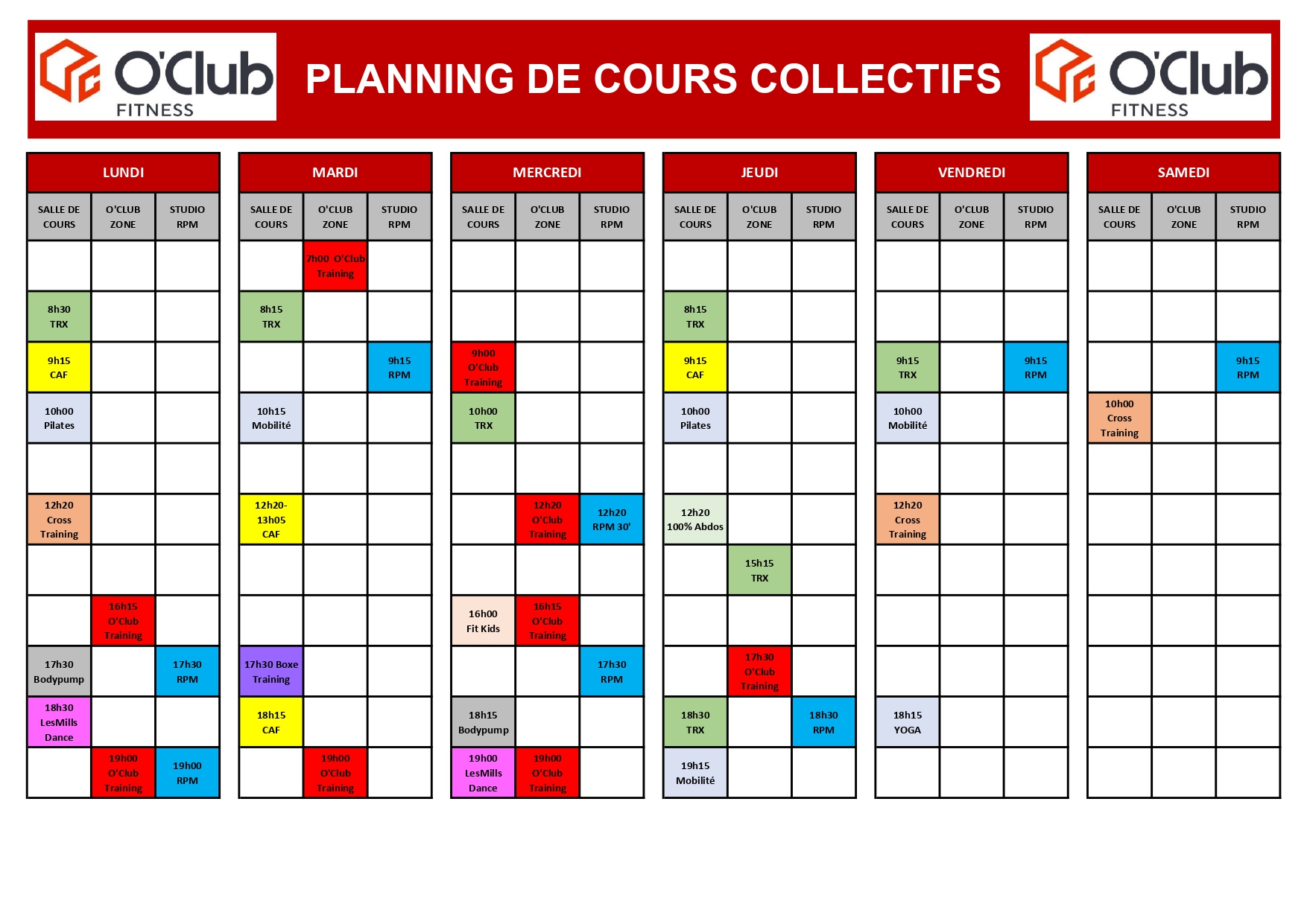 Planning des cours collectifs :
